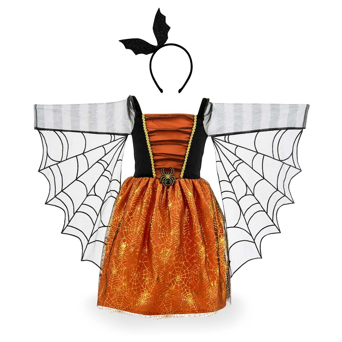 Ce déguisement sorcière Arabella permet à votre enfant de se glisser dans la peau d'une élégante sorcière aux teintes orangées. L'ensemble inclut un serre-tête scintillant avec des ailes de chauve-souris, un voile transparent pour les bras et un jupon orange métallisé orné de jolis motifs de toiles d'araignée. Les finitions soignées telles que les galons et l'araignée centrale ornée d'un petit diamant apportent une touche élégante au déguisement. Le petit plus de ce déguisement sorcière Arabella ? Quand votre enfant lève les bras, des manches toiles d'araignée se déploient, à l'image de son imagination !